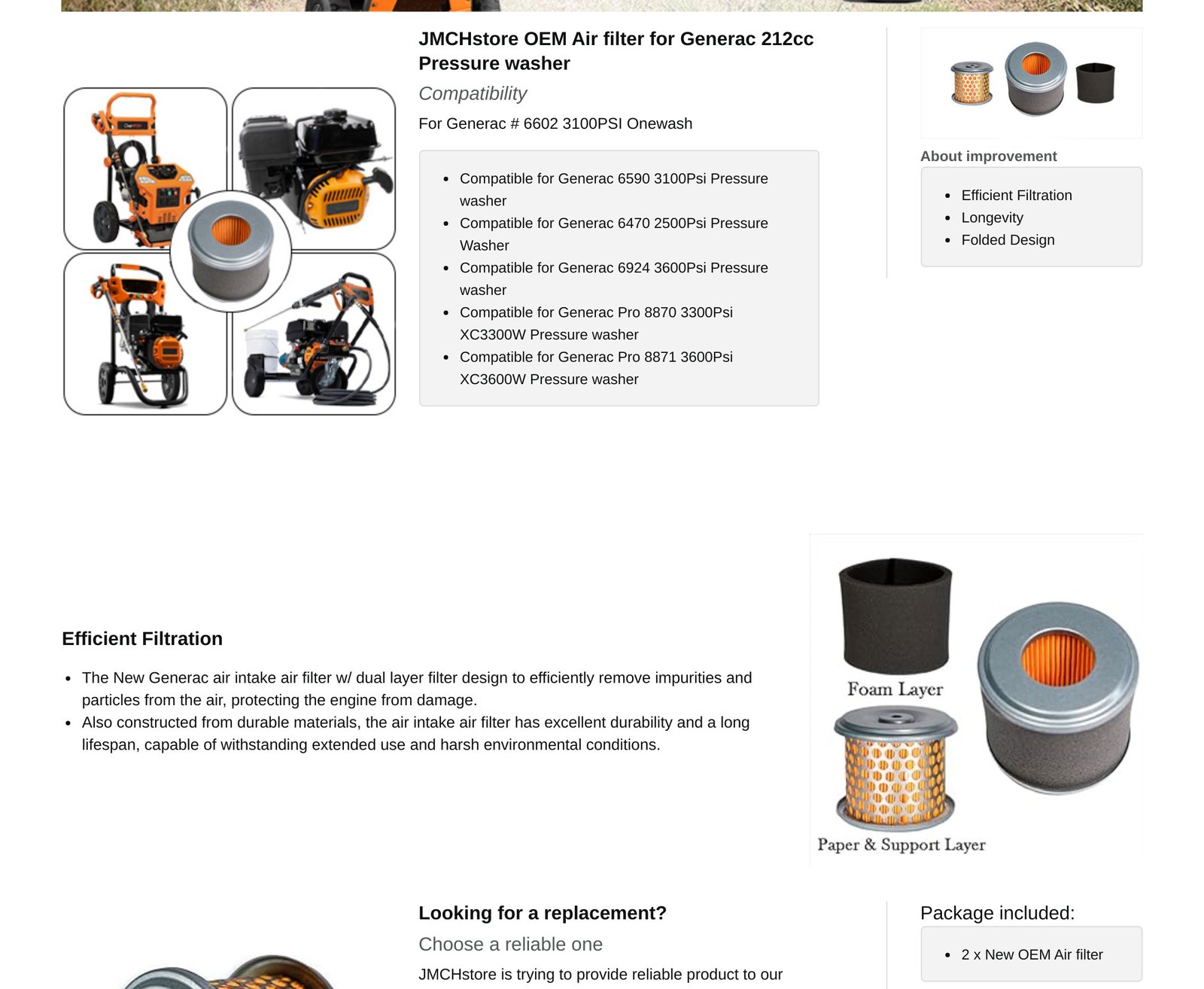 • JMCHstore Genuine OEM Air filter Replacement for Generac 212cc Pressure Washers / SpeedWash / OneWash