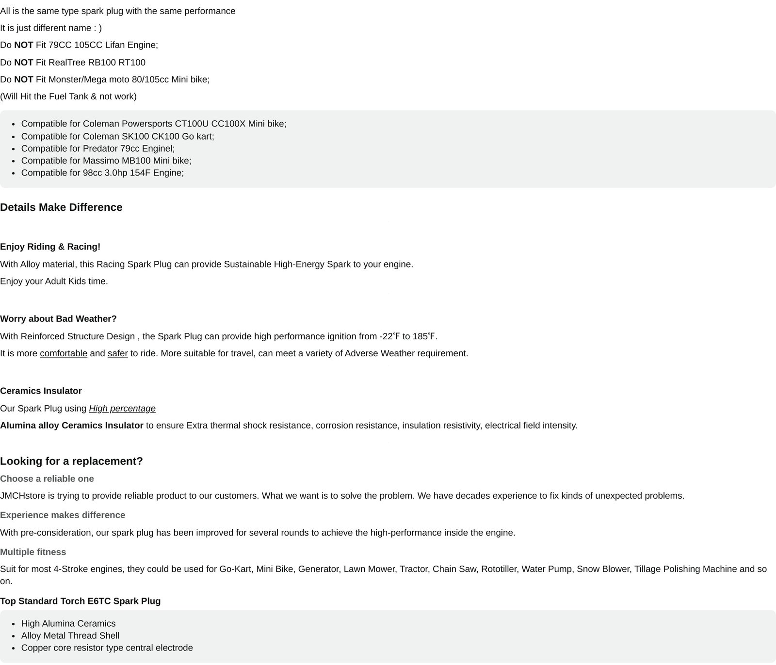 • JMCHstore Racing Spark Plug for Coleman CT100U CC100X Mini Bike;
