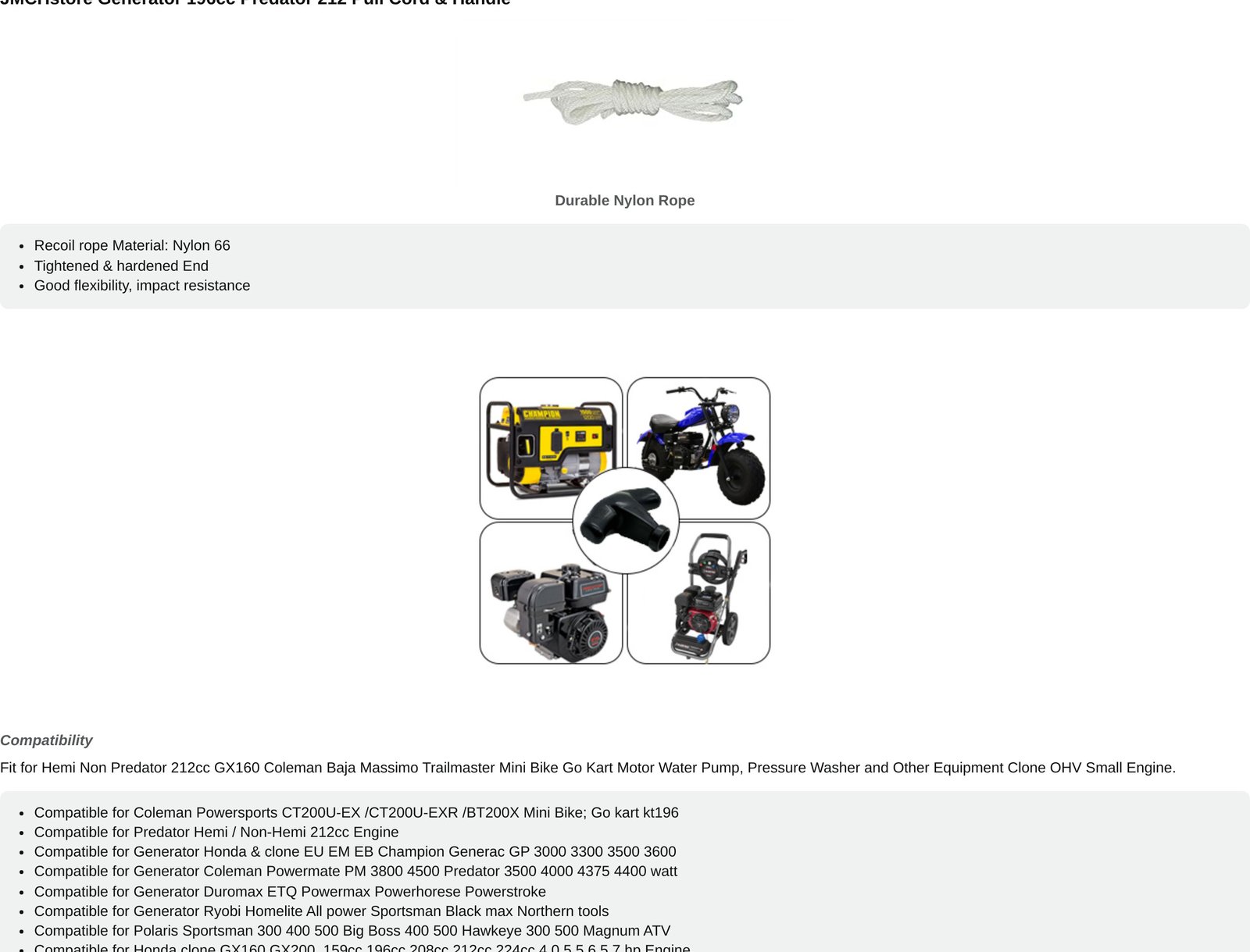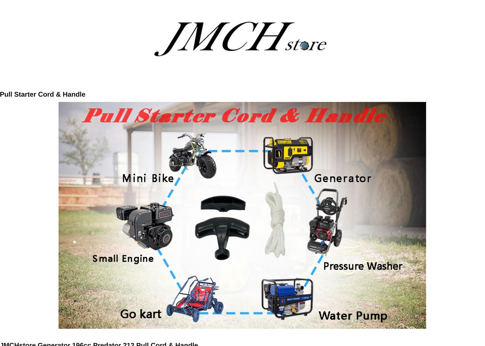 - JMCHstore Pull cord w/ New Handle for 49-224cc Engine Predator 212 Honda gx160 gx200 Coleman Baja Mini bike, Go kart, small engine, tiller, snow blower, pressure washer etc.