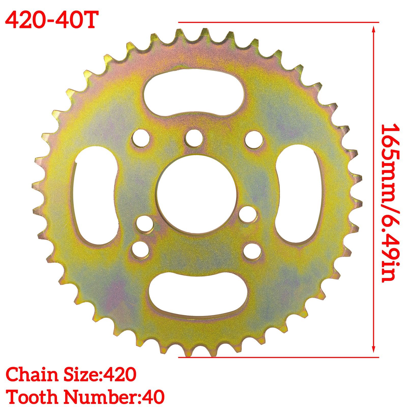 - 𝐏𝐫𝐨𝐝𝐮𝐜𝐭 𝐃𝐢𝐦𝐞𝐧𝐬𝐢𝐨𝐧𝐬: #40/41/420 Chain,Teeth: 40 Tooth/ Mounting Hole Distance (center to center, bolt hole circle): 49mm (1.93 inch)/ Center Hole Diameter: 37mm (1.46 inch)/ Overall Diameter: 165mm ( 6.49 inch) / Mounting Hole Diameter: 6.5mm (0.26 inch)x6.