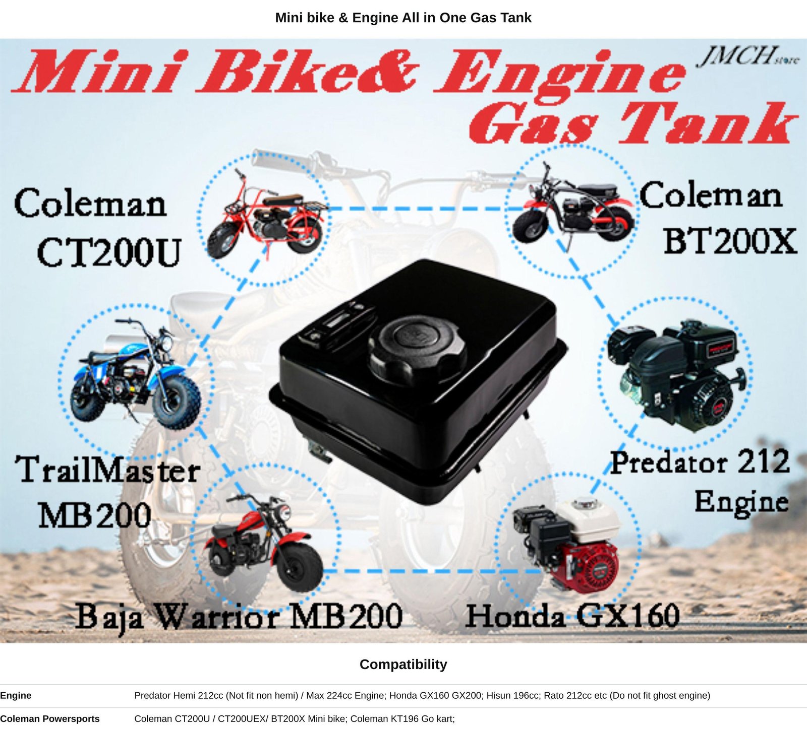 - JMCHstore All in one Gas tank for Coleman CT200U CT200U-EX BT200X Mini Bike; Baja MB165 MB200 Doodlebug Mini Bike; TrailMaster MB200-2 Minibike, Realtree RT200 196cc Mini Bike.