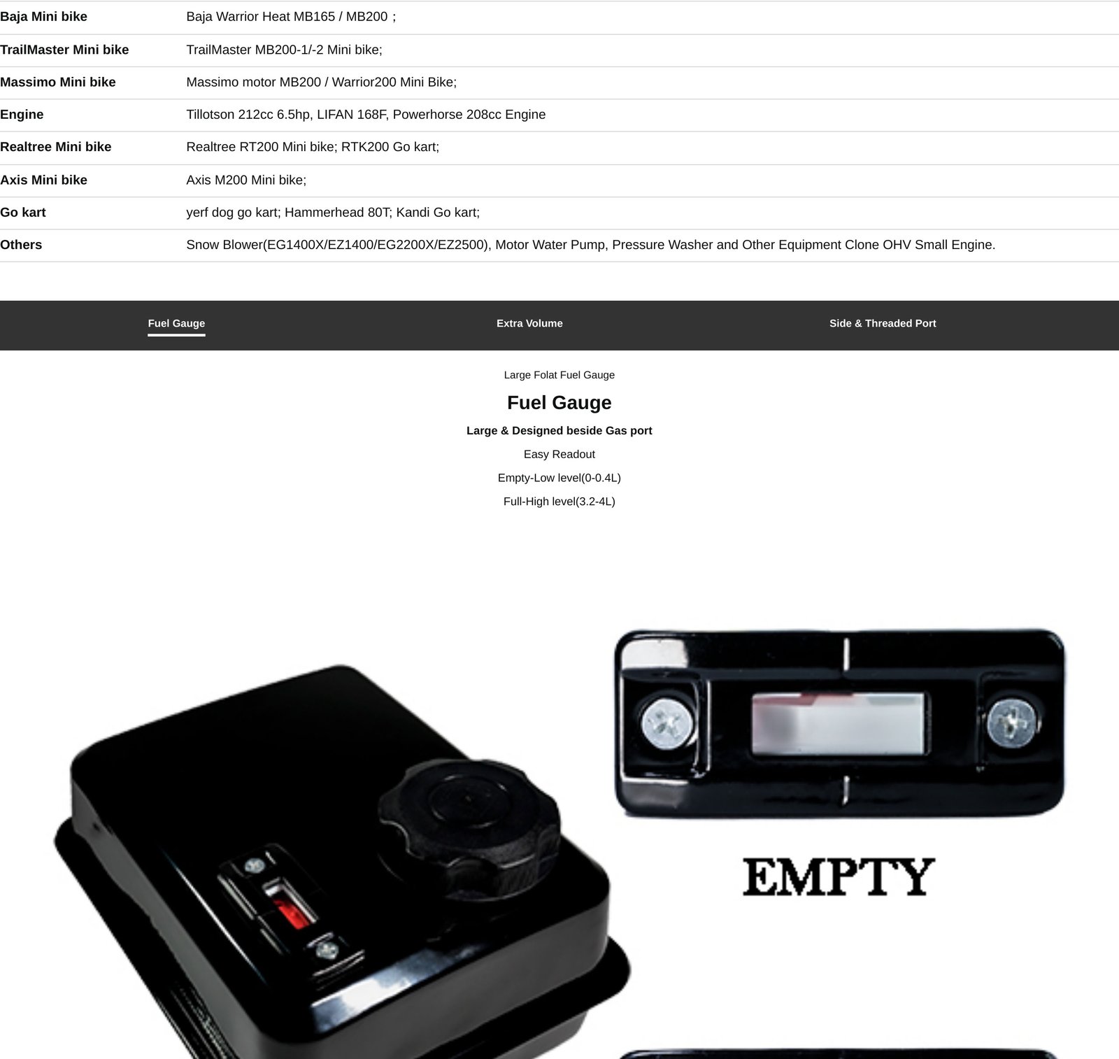 - Large Float Fuel Gauge ; Designed Beside Gas Port for easy readout when refilling, Working range from 0.4L to 3.6L;( 0-0.4L indicates full white- Low fuel, 3.2 – 4L indicates full red- Full Fuel)