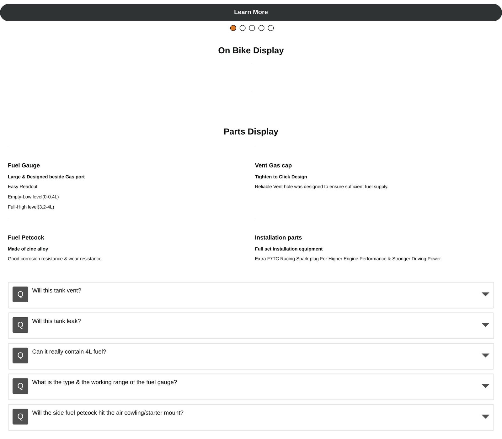 - Fuel Petcock Equipped; As our new designed Corner fuel outlet port, It become possible to install a fuel petcock to shut fuel when necessary; Also the metal petcock is much more durable than original plastic joint filter; ( We also provide the plastic one in package in case something unexpected)