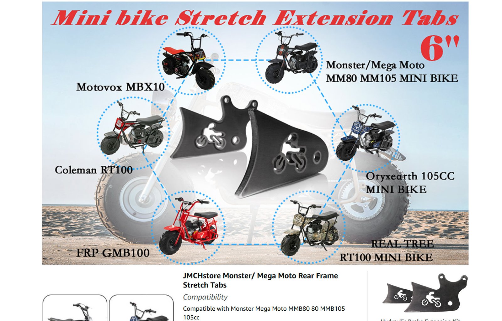 • JMCHstore 6 inch Mini bike Hydraulic Brake Stretch Tab Kit for Monster Mega moto MM-B80 80cc; MM-B105 105cc, For FRP GMB100 Mini Bike; Coleman Realtree RB100 RT100 Mini Bike; Motovox MBX10; For Oryxearth 105cc Kids Dirt bike;