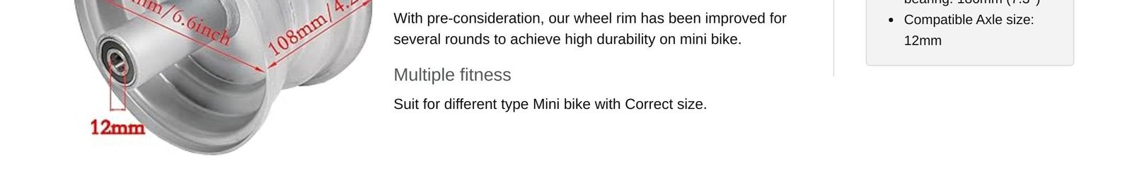• 𝐒𝐦𝐨𝐨𝐭𝐡 𝐏𝐞𝐫𝐟𝐨𝐫𝐦𝐚𝐧𝐜𝐞: Equipped with (2) 6201RS bearings, the rim ensures smooth and reliable rotation, reducing friction and extending the lifespan of your mini bike’s front wheel.