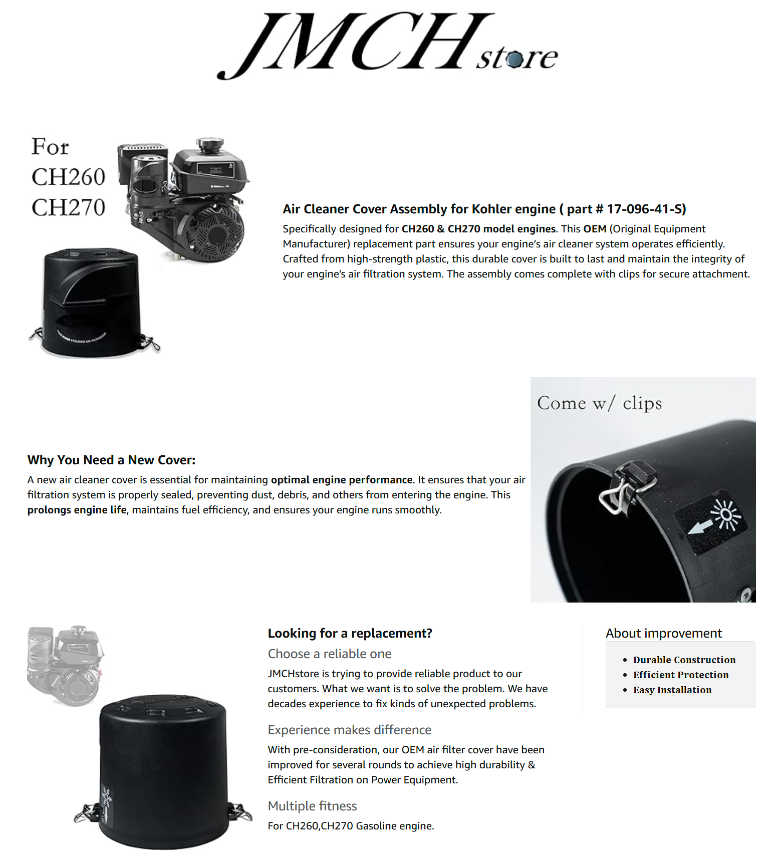 • JMCHstore 𝐎𝐄𝐌 𝐩𝐚𝐫𝐭 # 17 096 41-S Air Filter Cleaner Cover for Kohler CH260 & CH270 engines.