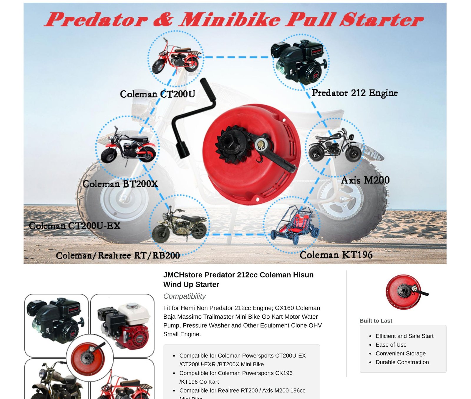 • JMCHstore Quick Fast Easy Pull Start Recoil Starter Assembly for Coleman CT200U CT200U-EX BT200X Mini Bike; TrailMaster MB200-2 Minibike, Realtree RT200 196cc Mini Bike, Axis M200 offroad bike