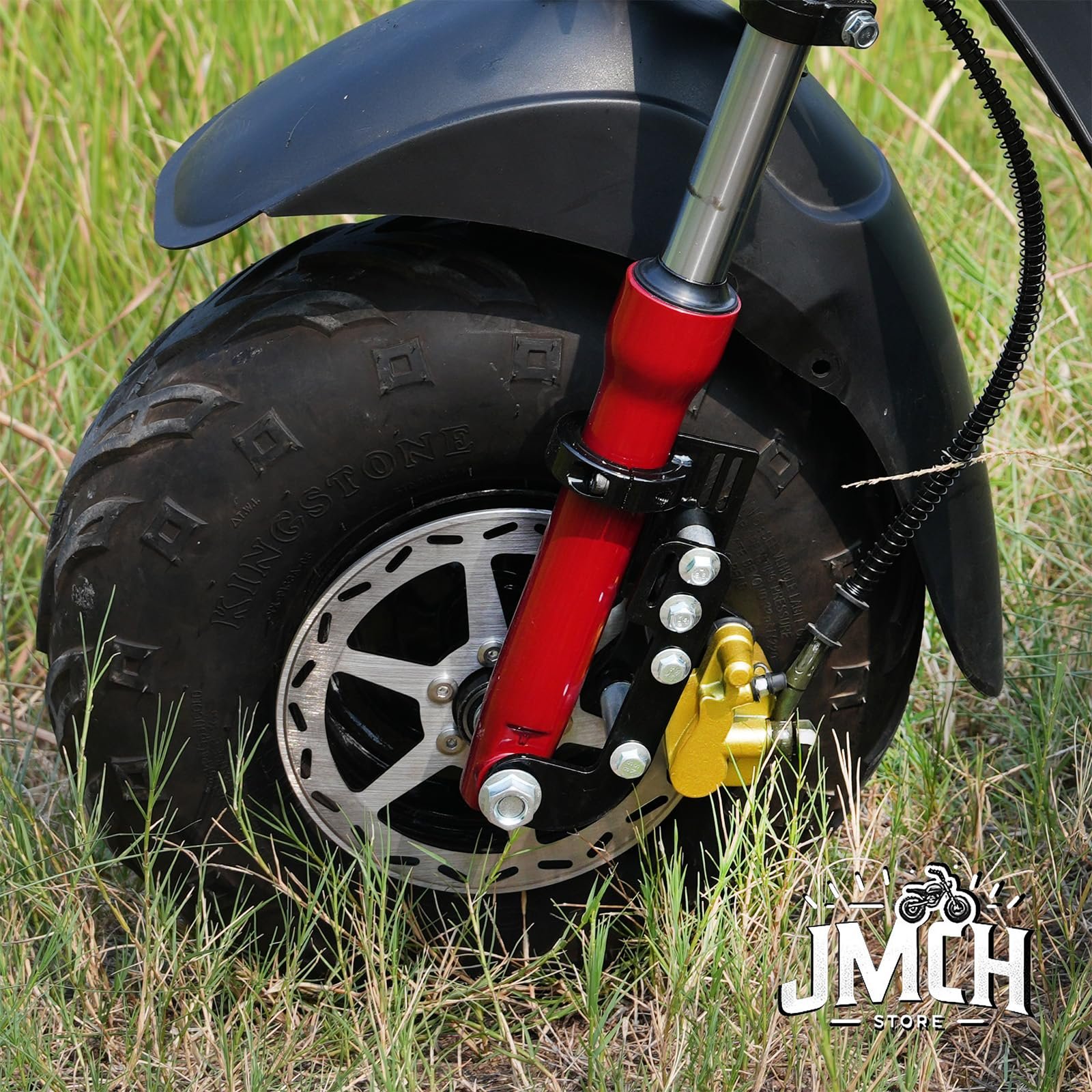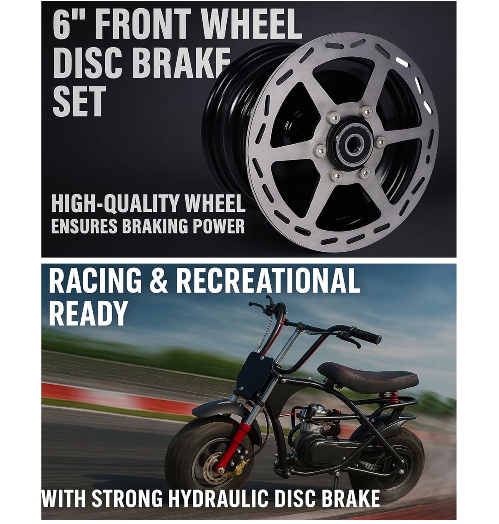 - 𝐂𝐨𝐦𝐩𝐥𝐞𝐭𝐞 𝐁𝐫𝐚𝐤𝐞 𝐊𝐢𝐭 – Includes 6-inch front rim with brake disc, hydraulic caliper, brake lever, line, master cylinder, spare brake pads, and mounting brackets