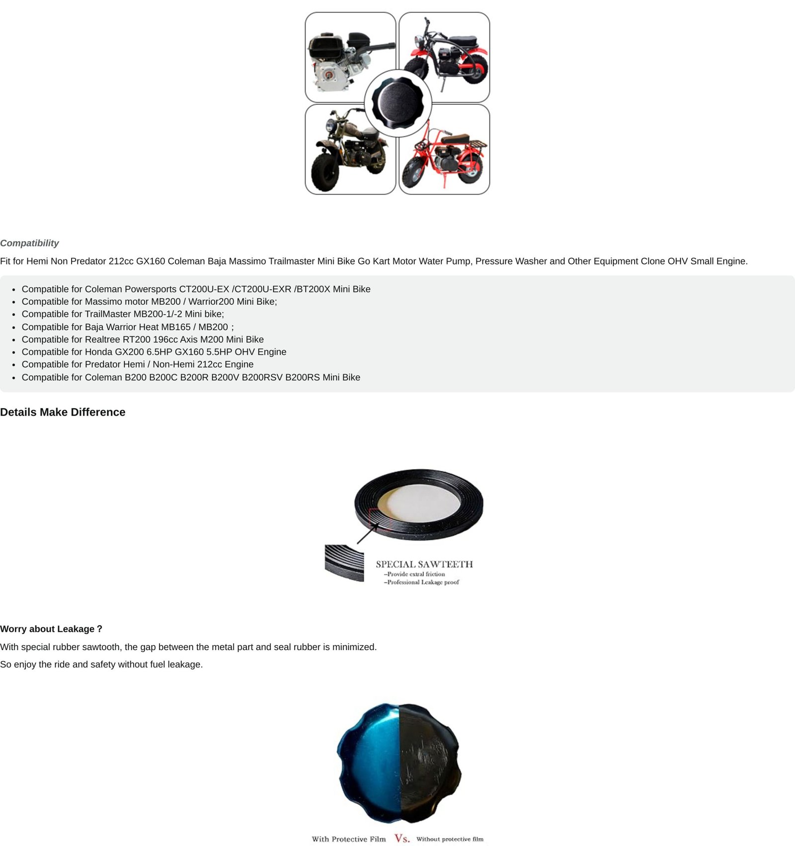 - JMCHstore Metal Fuel Gas Cap for Coleman CT200U CT200U-EX BT200X Mini Bike; Baja MB165 MB200 Doodlebug Mini Bike; TrailMaster MB200-2 Minibike, Realtree RT200 196cc Mini Bike.