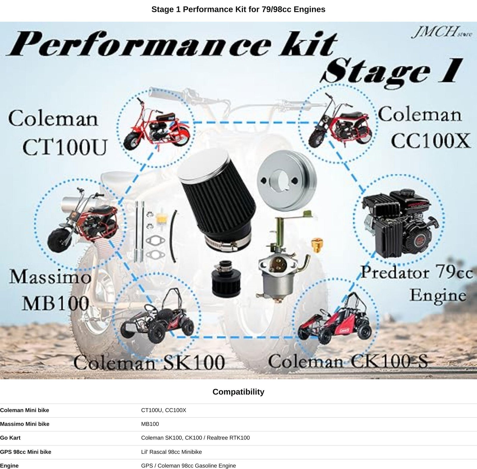 - JMCHstore Black Stage 1 Performance kit for Coleman CT100U CC100X 98cc Mini Bike; Massimo MB100 79cc mini bike;
