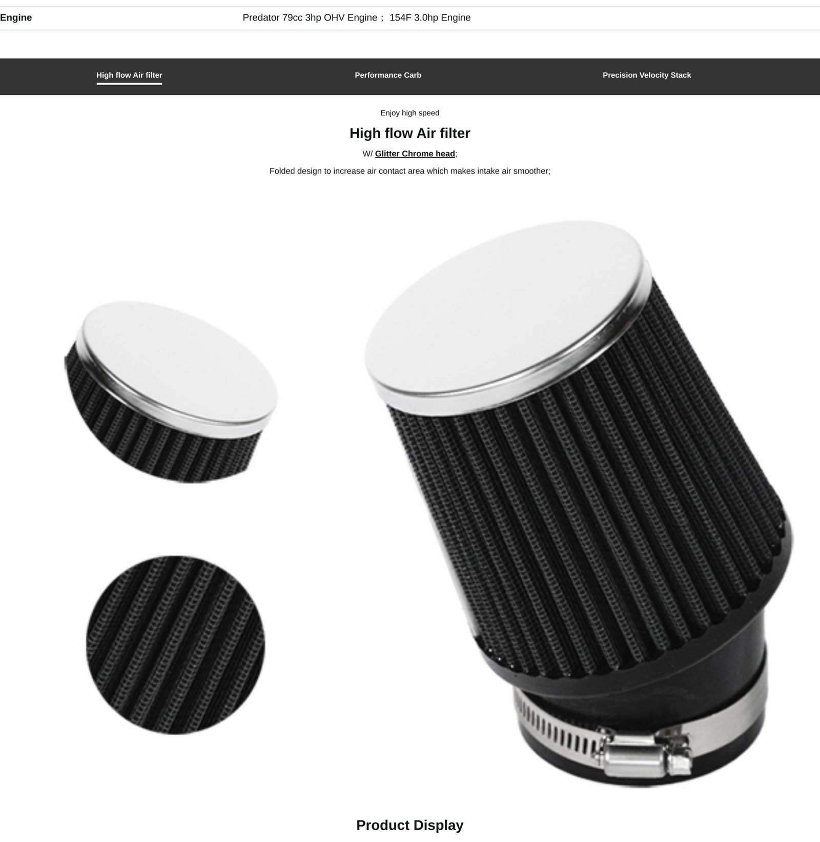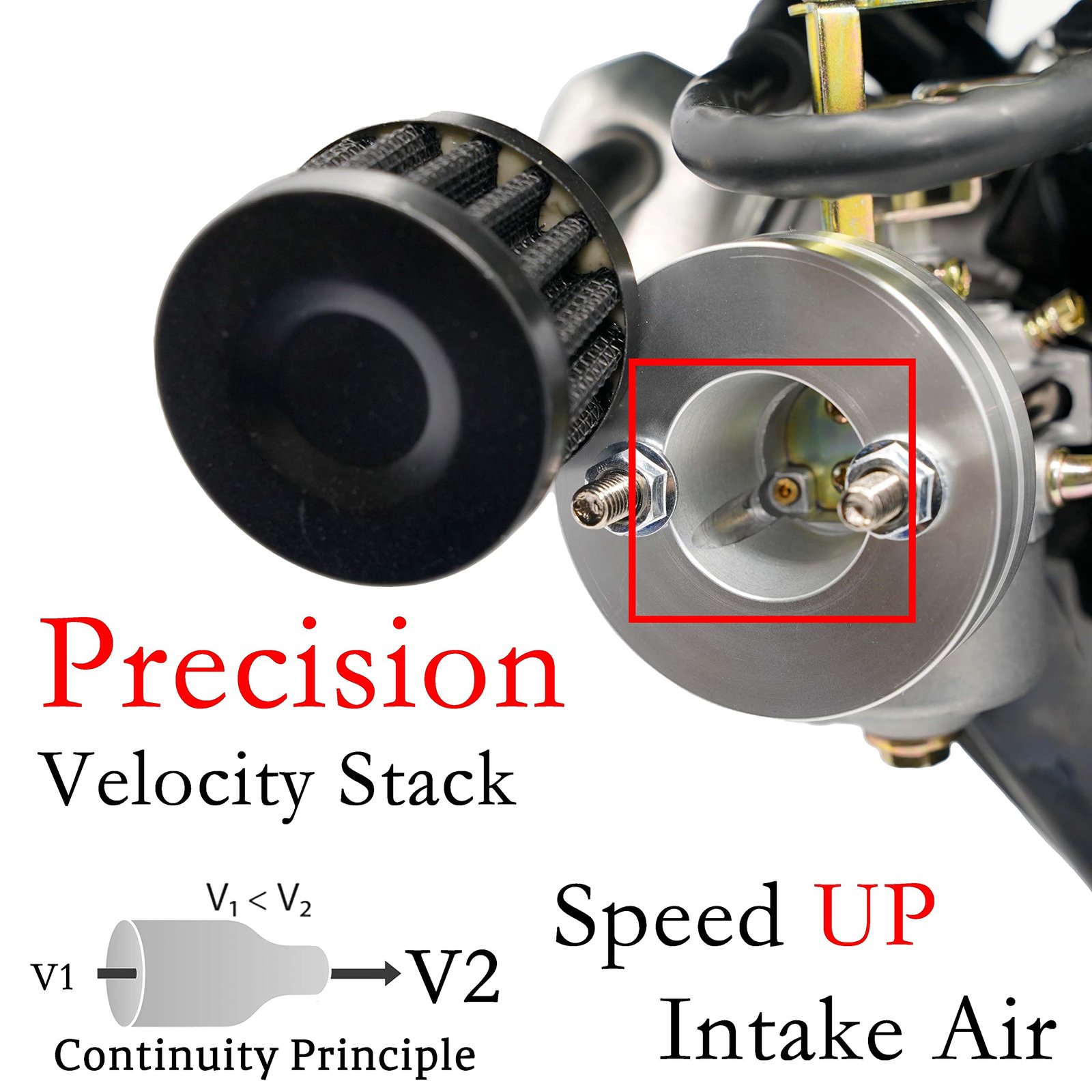 - Higher Top Speed. Thanks to High Flow Air Filter & Velocity stack, Not only the intake air become smoother but also speed up. W/ massive amount of intake air , you should experience an increased top speed of about 5 -10 mph.