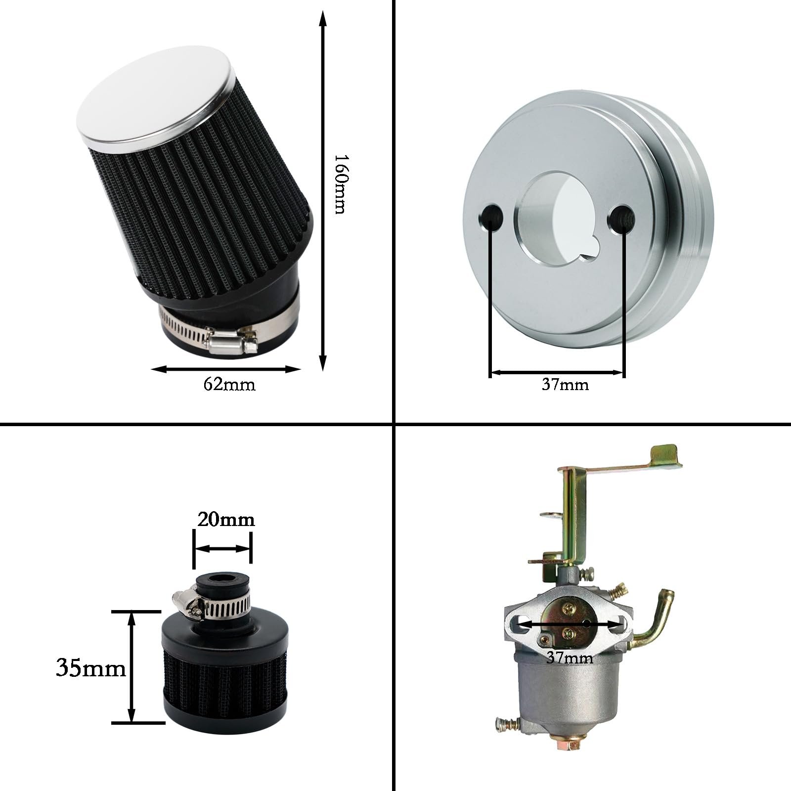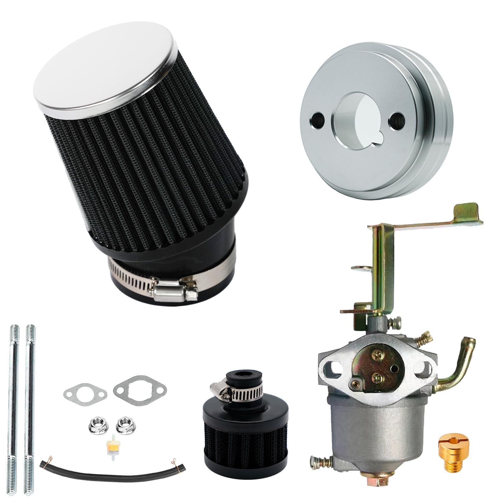 - Package included: 1 x Performance Carburetor,1 x Rich main jet ;1 x High flow Air filter,1 x Velocity stack, 1 x Air Filter Breather;1 x Fuel filter, 2x Extended mounting studs, 2 x Nut, 2 x Gaskets, 1 x Fuel Line, 2 x Hose Clamps.