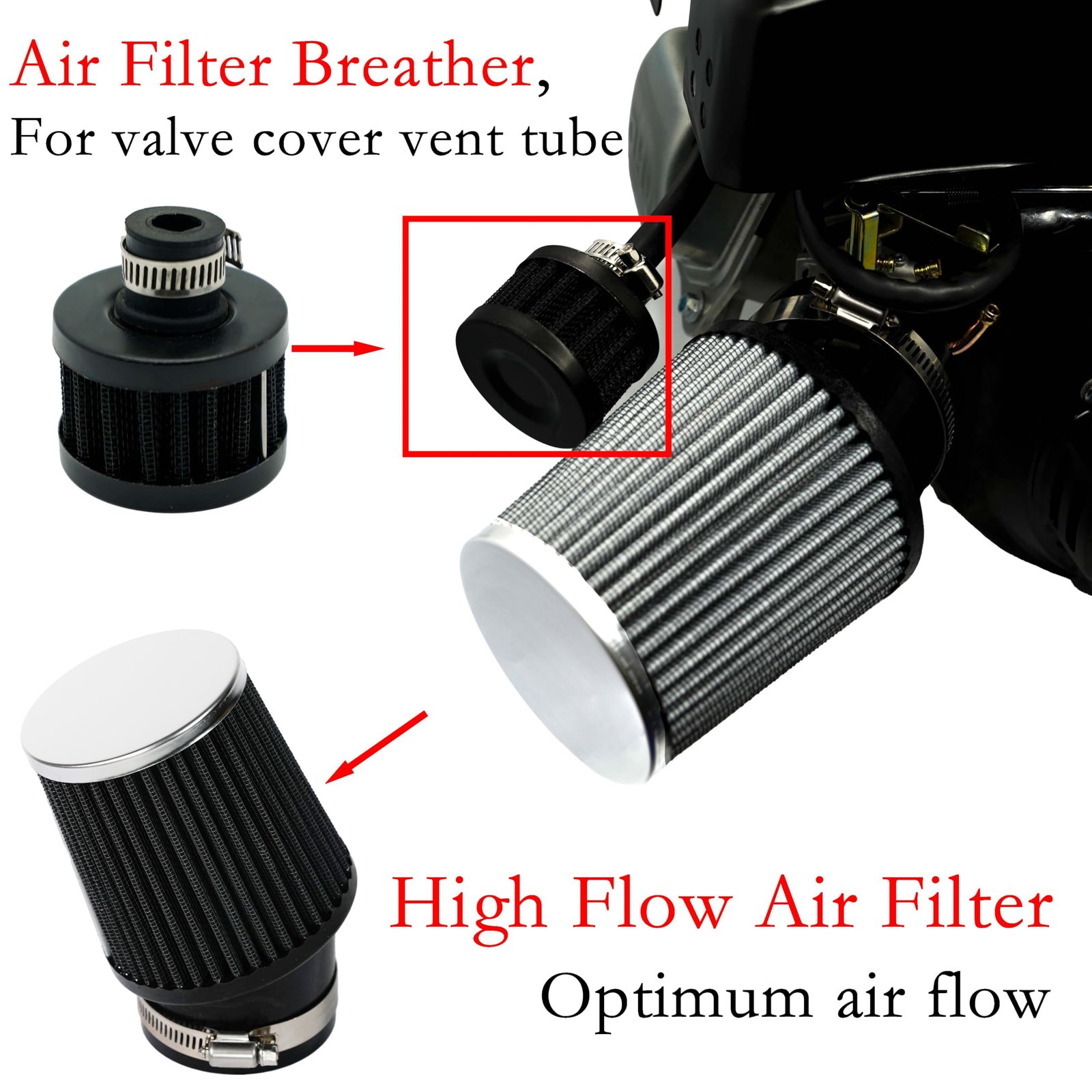- Air Filter Breather, for valve cover vent tube. Once you remove the stock air filter box, you have to disconnect the breather tube that goes to the valve cover. This breather filter is the perfect solution for the breather tube.