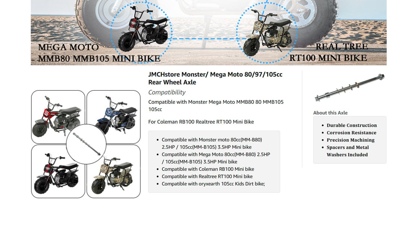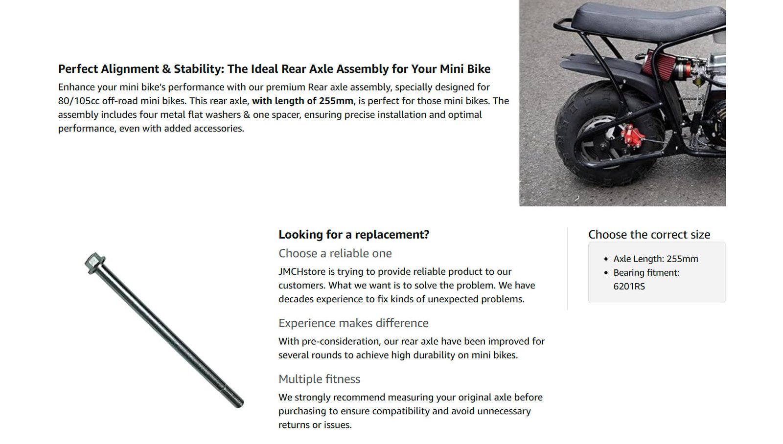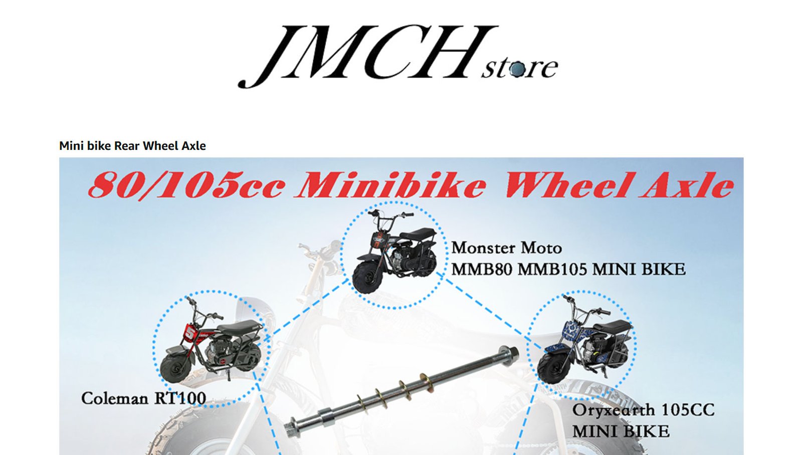 • JMCHstore Mini bike 255mm rear wheel axle for Monster Mega moto MM-B80 80cc; MM-B105 105cc, For Coleman Realtree RB100 RT100 Mini Bike; For oryxearth 105cc Kids Dirt bike;