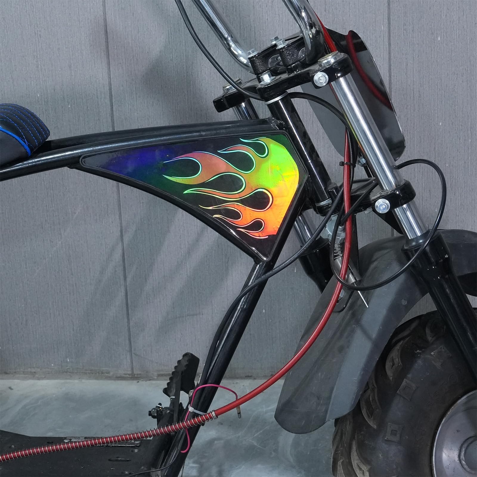 Give your mini bike the bold, retro style it deserves with our holographic flame side panel decals – designed to perfectly match the iconic MBX10 flame look. These high-quality vinyl stickers feature a dazzling holographic finish that catches light from every angle, creating a head-turning visual effect whether you’re riding or parked.