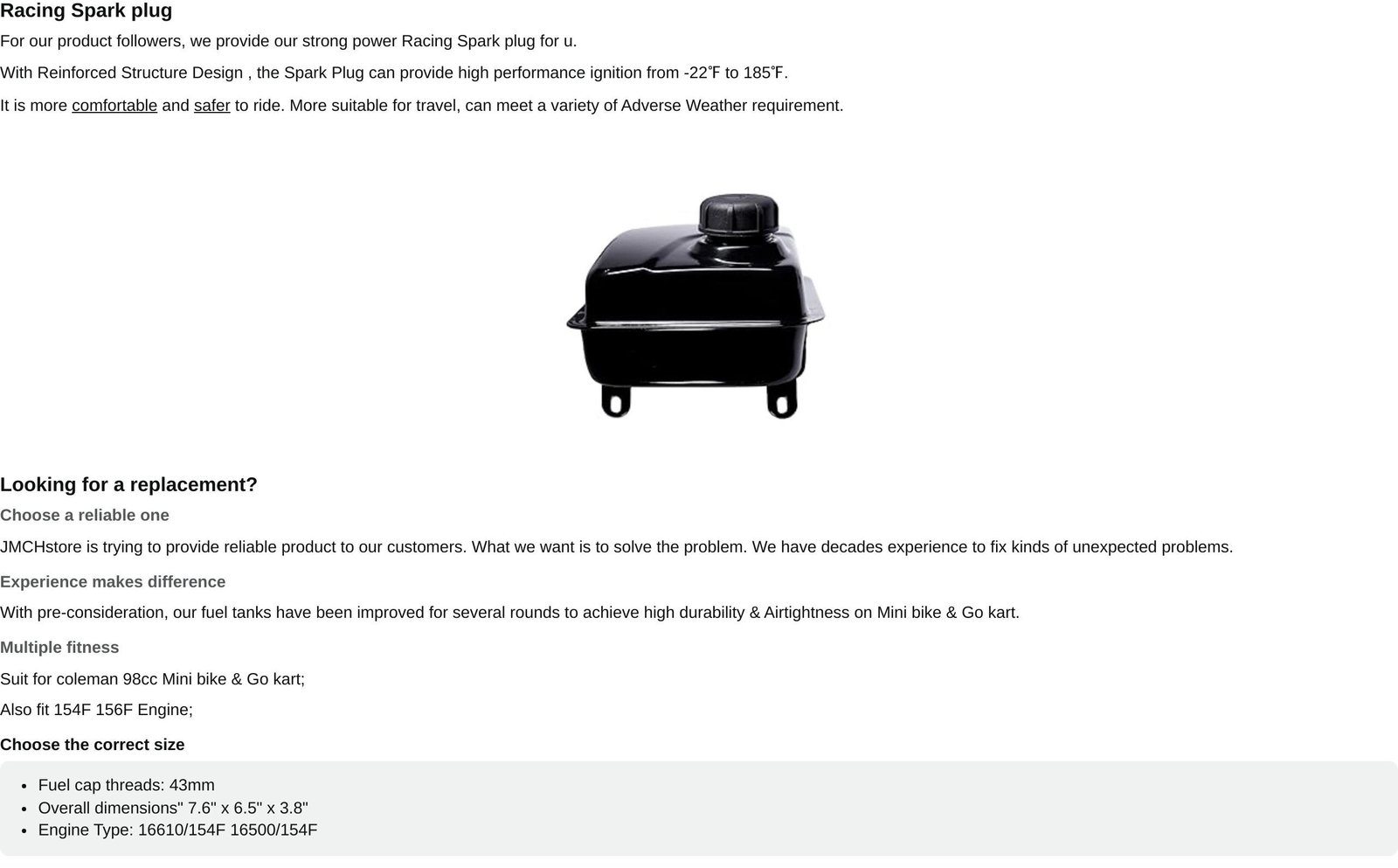 • Capacity: 0.42 Gallon; Screw on fuel cap is slightly off center